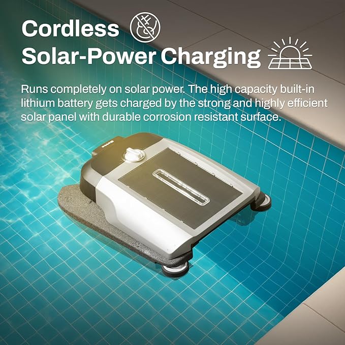 - 100% Solar Powered & Cordless – Runs entirely on solar energy with no cords, plugs, or charging needed. Just drop it in and let the sun power effortless, eco-friendly cleaning all season long.