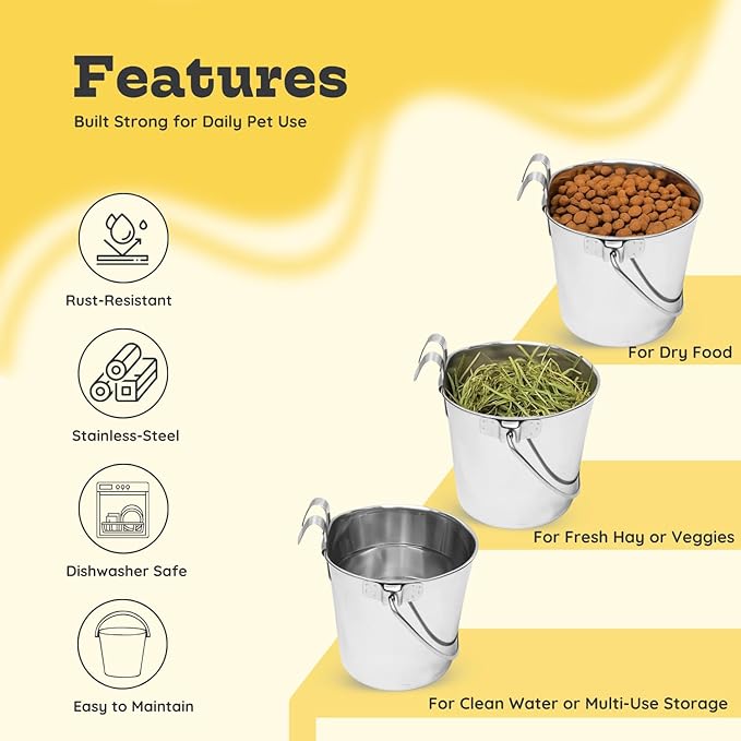 4 Quart Stainless Steel Flat Sided Bucket with Dual Hooks | 2 Pcs Durable Food & Water Bowl for Dogs Cats Goat & Livestock | Fits kennel Cage Critter Crate Hanging Pet Pail | Multipurpose