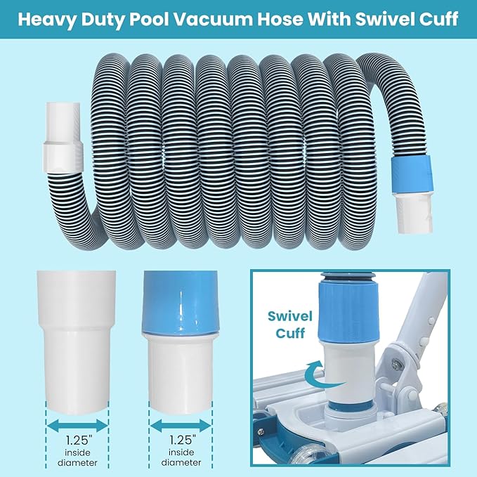 - LIGHTWEIGHT & FLEXIBLE: Heavy duty hose has strong suction and doesn't kink. Swivel cuff end can connect directly onto the vacuum head(included) and the non-swivel end connects to the skimmer or pump inlet, which can improve strength, flexibility and maximum flow rate. Pool vacuum head is weighted so it sinks right to the bottom of your pool and stays there.