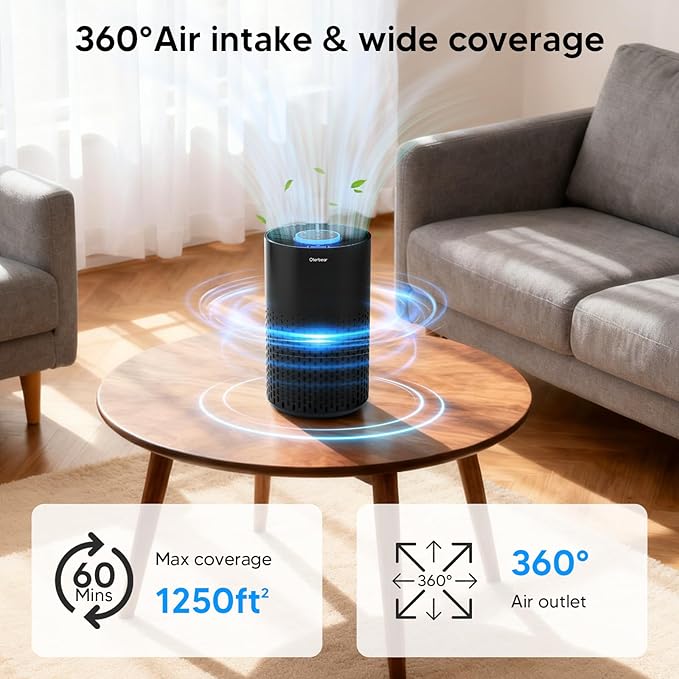 - 【Coverage 1250 Ft²&360° Air Intake】 Air purifier for home pet achieved 360° air intake, which increased the speed of filtering air—that fits up to 1250 sq ft in 60 minutes, suitable for home, bedroom,dorm, living room, office, nursery, kitchen,basements, etc.