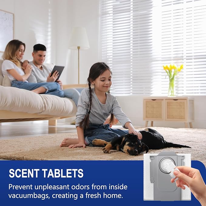 - 【Efficiency Filtration & Odor Removal】The vacuum dust bag features a 2.7L large capacity. Made with 2 layers of non-woven fabric and 2 layers of melt-blown fiber, it effectively filters 99% of dust and debris. Scent Tablets are placed in a dust bag to remove vacuum odors and keep the air fresh