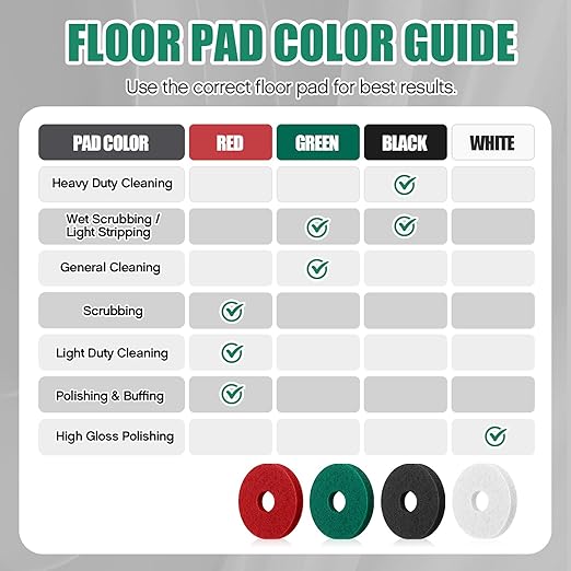 - Versatile Design: our commercial floor scrubber pads are practical cleaning tools; The black pad is for heavy duty cleaning and stripping of floor wax, not suitable for daily cleaning; green pad is for daily heavy-duty cleaning and light stripping; red pad is for light cleaning and polishing preparation; white pad is for polishing, not suitable for cleaning