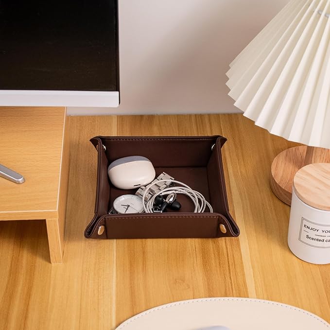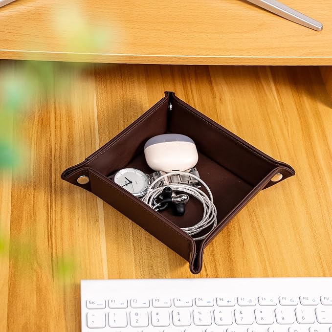 - Quality: our Valet tray is made of high-end Pu and hardware. Both sides are made of leather, which looks advanced and simple. It has certain weight and good overall product texture. Durable and not easy to damage.