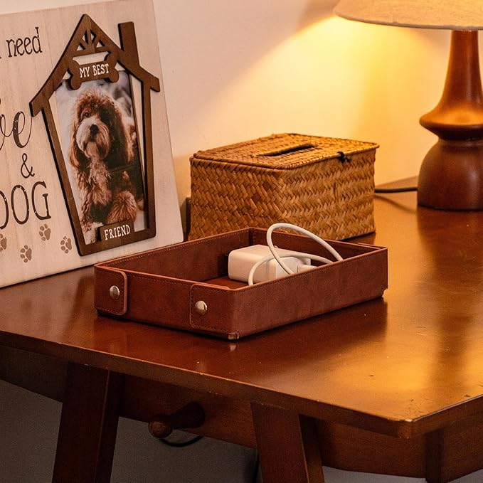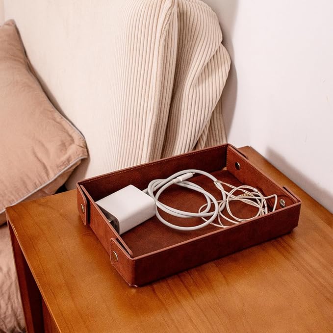 - Quality: our Valet tray is made of high-end Pu and hardware. Both sides are made of leather, which looks advanced and simple. It has certain weight and good overall product texture. Durable and not easy to damage.