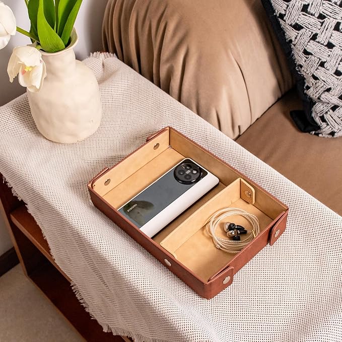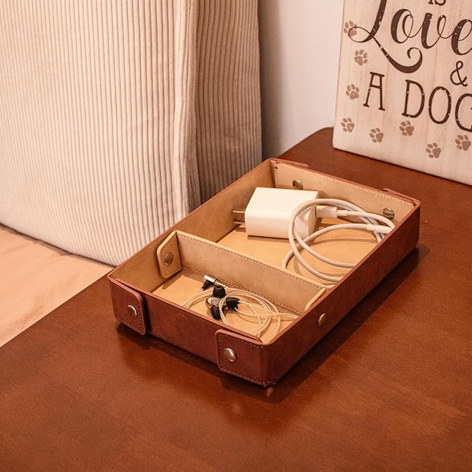 - Quality: our Valet tray is made of high-end Pu and hardware. Both sides are made of leather, which looks advanced and simple. It has certain weight and good overall product texture. Durable and not easy to damage.