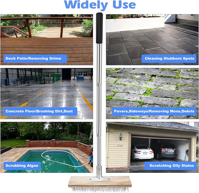 - Aggressive Cleaning Power, ROLKAR pool scrubber brush is designed for tough cleaning tasks and longevity performance. Premium rust proof stainless steel bristles are implanted securely into the pool brush head, ensuring they won’t fall out or wear down over time. Reinforced aluminum alloy structure built to withstand rigorous scrubbing while staying lightweight. This floor scrub brushes efficiently remove stubborn moss, algae, making it ideal for cleaning patio,driveways, pavers,steps,sideways.