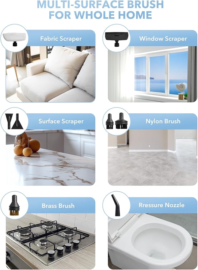 - [1600ML Large-Capacity Water Tank]-- Steam cleaner for home comes with a 1600ml water tank for extended use, reducing frequent refills. Perfect for deep-cleaning your entire bathroom, kitchen, or car interior. The see-through design lets you monitor water levels at a glance.