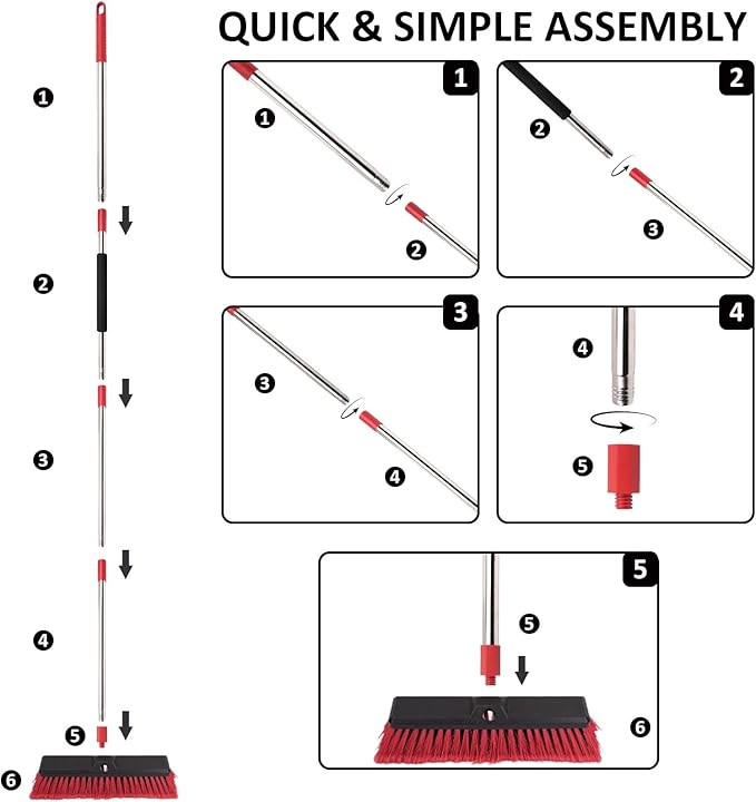 - EASY ASSEMBLY & SPACE-SAVING STORAGE: Multi-section design allows tool-free assembly. The top of the handle features a hanging hole for easy wall storage, keeping the outdoor broom off the floor for easy drying and maintenance