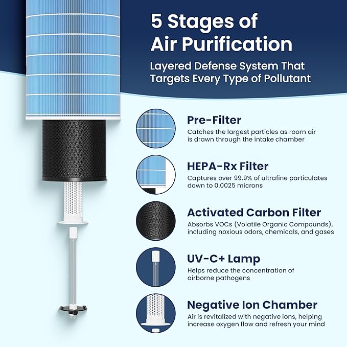 - 5 Stage Air Purifier Filter: JADE 2.0 has a prefilter for dust and hair, a patented HEPA-Rx filter that filters out up to 99.9% of undesirable particles, Carbon absorbs VOCs, pet odors and chemical gases and an energizing ion system