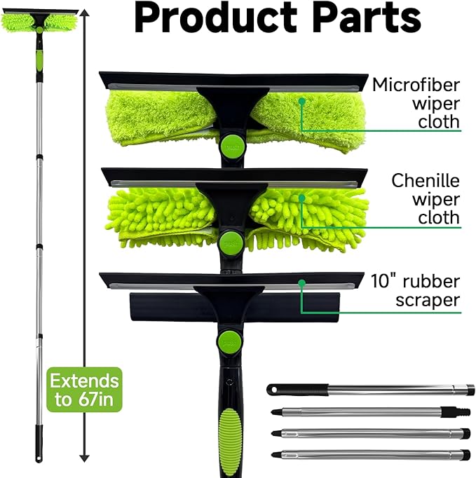- 【FUNCTIONAL & VERSATILE】 Multi-surface cleaning with a combination of different scrubbers and blade, this window squeegee cleaning kit is a necessity in household cleaning. It makes cleaning everywhere easy, including both indoor and outdoor, high and low; no more dangerously stepping on a ladder to reach for cleaning. Effortlessly clean up areas and surfaces such as car, bathroom door, indoor and outdoor windows, French window, wide windshield, balcony glass, mirror, office glass wall, camper.