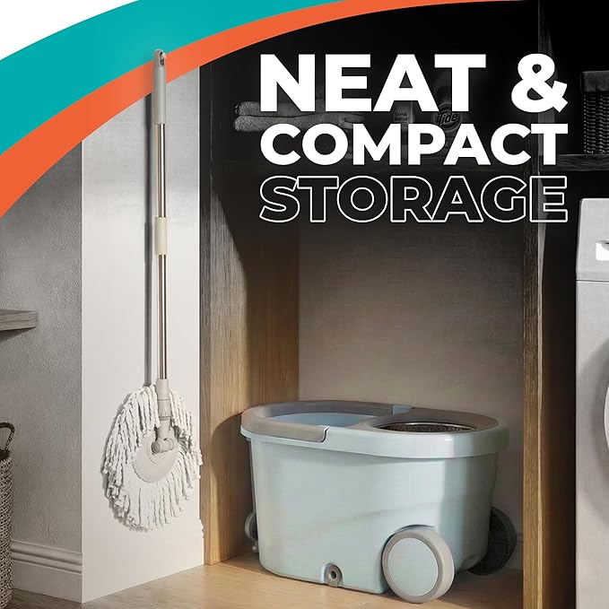 - SELF-WRINGING MOP SYSTEM: Enjoy hands-free cleaning with the 360° self-wringing system. No bending or pedals needed—simply dip and spin. It removes excess water for streak-free floors, making cleanups faster and easier for busy households