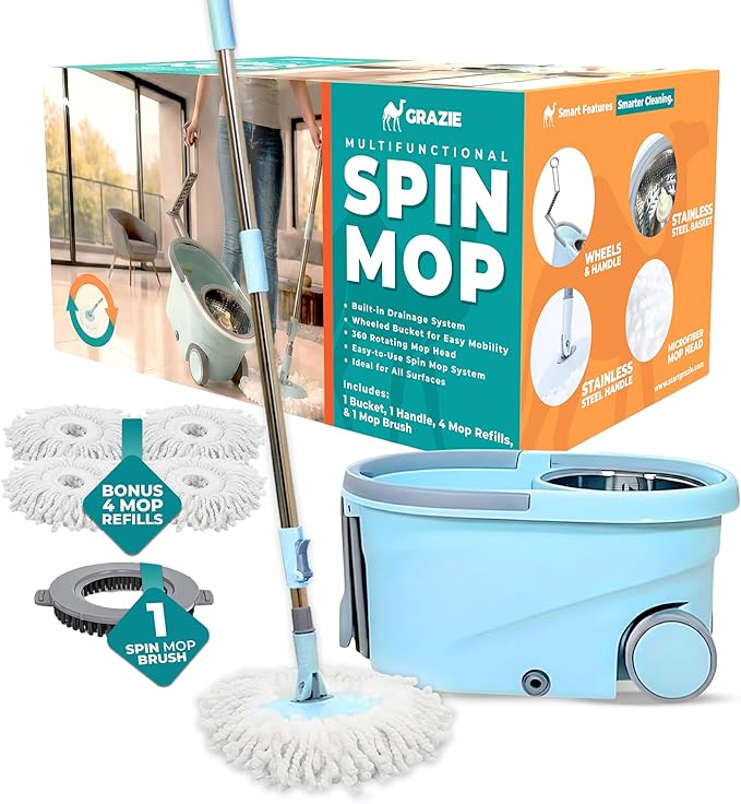 - DURABLE & COMPACT DESIGN: BUILT FOR DAILY USE: Made with a stainless steel handle, the Grazie Spin Mop is sturdy for everyday use. Its compact design is easy to store while ensuring durability for regular cleaning tasks in busy households