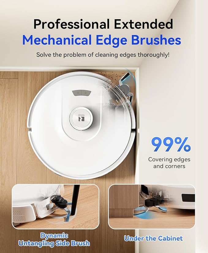 - ใ๐ฆ๐ถ๐ฑ๐ฒ ๐๐ฟ๐๐๐ต ๐๐ ๐๐ฒ๐ป๐๐ถ๐ผ๐ป ๐๐ฒ๐๐ถ๐ด๐ป: ๐๐ฑ๐ด๐ฒ ๐๐ฒ๐ฒ๐ฝ ๐๐น๐ฒ๐ฎ๐ป๐ถ๐ป๐ด & ๐๐ป๐๐ถ-๐ง๐ฎ๐ป๐ด๐น๐ฒ ๐ฆ๐๐ฟ๐๐ฐ๐๐๐ฟ๐ฒใ-Traditional vacuum robot struggle to clean wall edges, cabinet corners, and other โblind spotsโ with fixed side brushes. The mechanical arm-extended side brush flexibly extends and retracts, providing over 30% more horizontal coverage than standard side brushes. Effortlessly sweeping dust from living room baseboards and bedroom wardrobe crevices, it eliminates the frustration of unclean corners. Additionally, the side brush features an anti-tangle design that minimizes hair entanglement during cleaning, reducing the hassle of post-cleaning maintenance