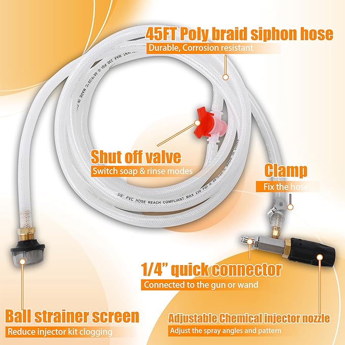 - Get Consistent Performance: This power washer chemical injector isn’t limited by gravity and works flawlessly for elevated cleaning tasks. Paired with the included 45ft siphon hose, it delivers reliable chemical draw over long distances for easy elevated or far-reaching jobs.