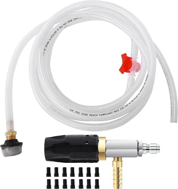 - Precise Chemical Mixing: The pressure washer injector kit includes 14 black coded proportioners for easy, precise control over chemical concentration. A ball strainer screen filter reduces the injector kit clogging. Get the perfect mix for maximum cleaning power every time, while using your chemicals efficiently.
