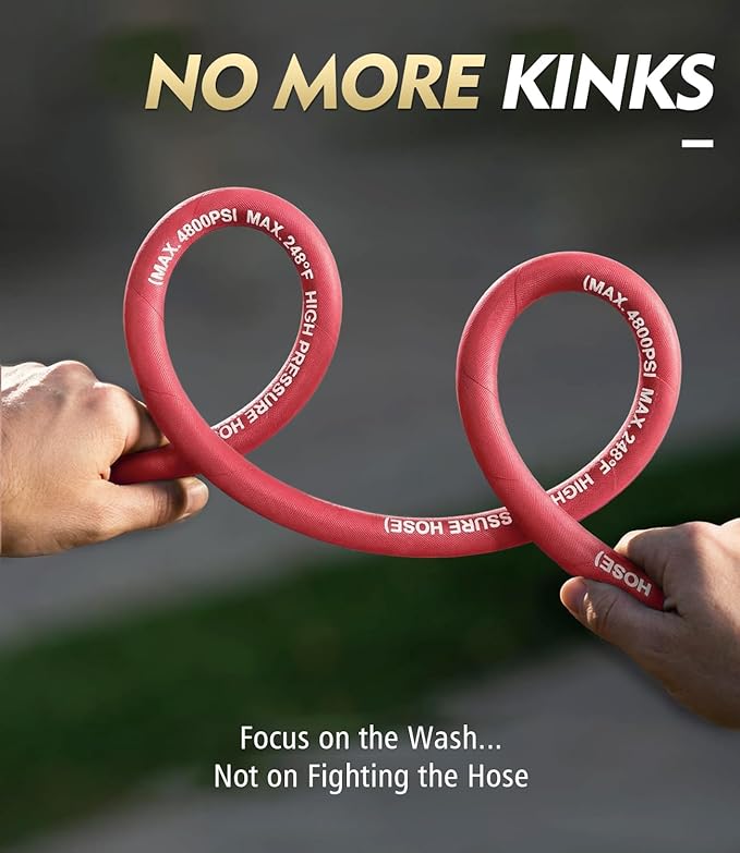 - 【3/8" ID Pressure Washer Hose】This 3/8" pressure hose delivers greater flow and stronger cleaning power than standard 1/4" hoses. Built with premium synthetic rubber and upgraded 8-strand steel wire braiding, it ensures even pressure, enhanced burst resistance, and excellent flexibility. Rated 4800 PSI working, 16,000 PSI burst, and heat-resistant up to 120°C / 248°F, it’s ideal for heavy-duty residential, commercial, and industrial cleaning.