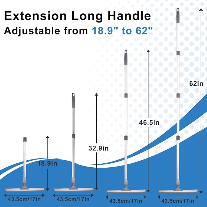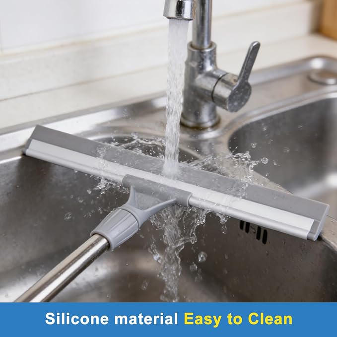- Silicone Squeegee Head:This squeegee broom for floor is equipped with a 17-inch wide cleaning head,It can clean the floor more quickly。 the blade of squeegee broom for floor is made of Silicone, which is safe to clean tile floors, large windows, garage concrete floor, etc. And garage squeegee concrete floor won't leave any scratches or marks. long handle squeegee, we adopts good quality stainless steel, which will not break or bend in use. This helpful garage floor squeegee is a good assistant in household