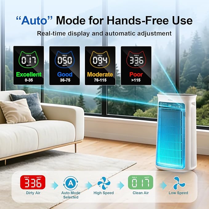 - Smart Air Quality Monitoring & App Control: Built-in high-sensitivity laser PM2.5 sensor, plus temperature and humidity sensors, provide real-time air quality monitoring. The large HD display shows air status at a glance. Features include Auto Mode, Sleep Mode, Timer, Child Lock, Light Control, plus App and Google Assistant voice control for hands-free convenience.