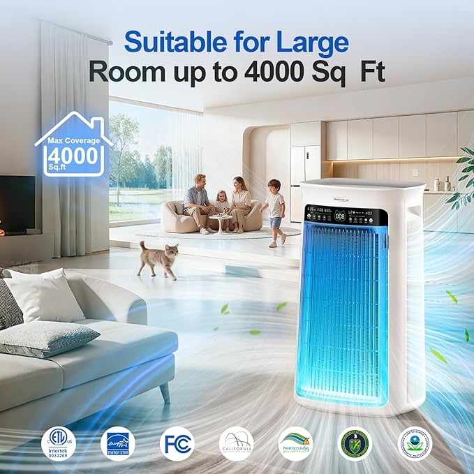 Air Purifier Large Room,True H13 HEPA Air Purifier for Home & Bedroom, Covers Up to 4000 Sq. Whole House Air Purifier, PM2.5 TEMP HD Sensor, Large Screen Display, 22dB Quiet for Pets Families
