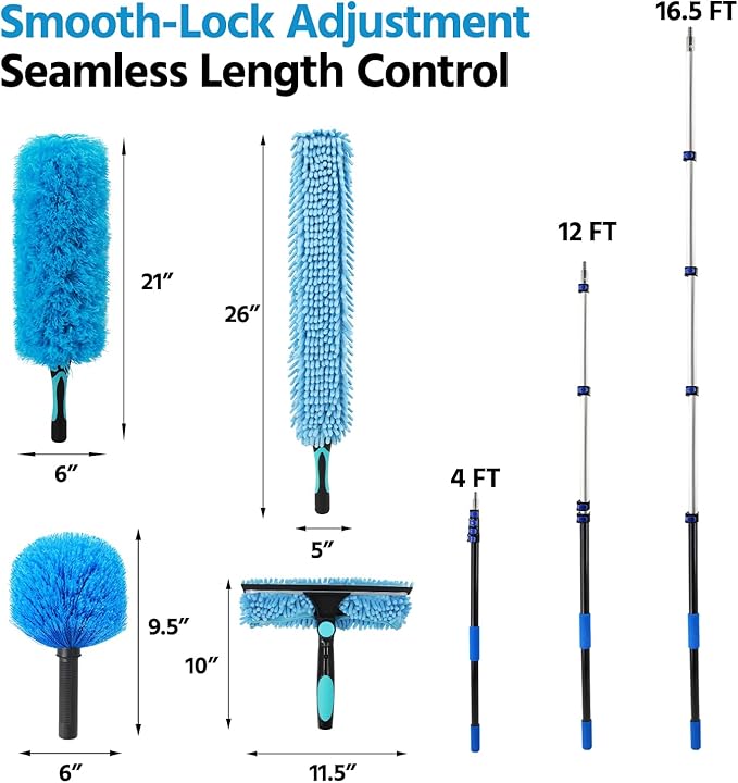 23FT High Reach Duster Cleaning Kit with Extension Pole, Ceiling Fan Cleaner Duster with 4-16.5 ft Telescoping Pole, 2 in 1 Squeegee for Window Cleaning, Spider Web Brush for Shower Glass Car Cleaning