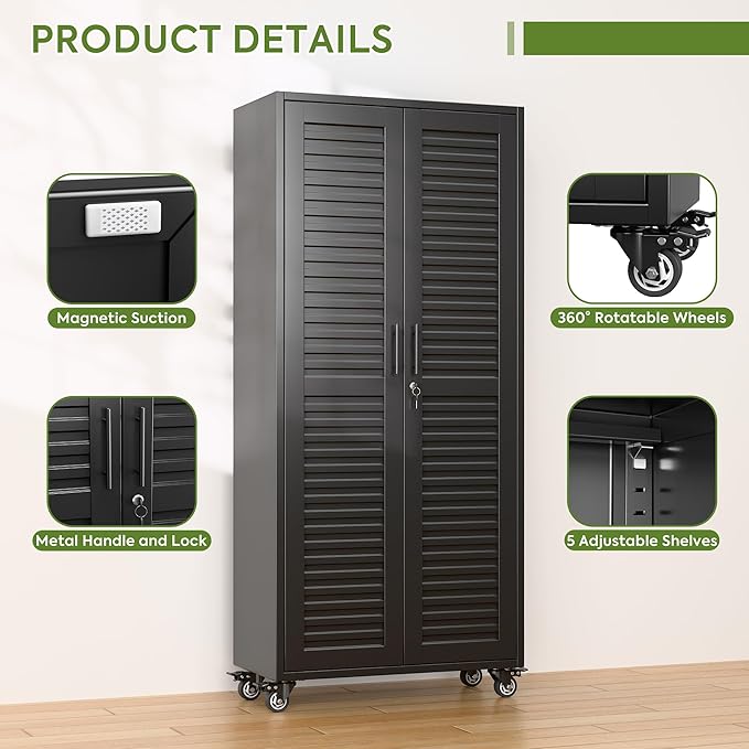SUXXAN Garage Storage Cabinet with Wheels Pegboard and 5 Adjustable Shelves, 71"x 31.5"x15.8" Metal Lockable Cabinet with Louvered Doors, Tool Storage, Home Office Garage, Gym, School (Black)