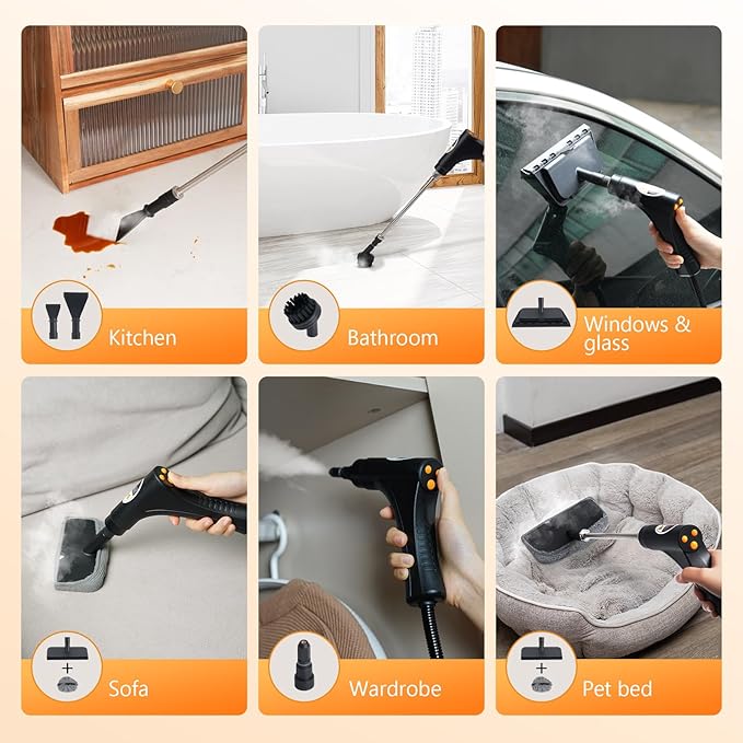 - Powerful High-Temp Deep Clean: Unleash 1500W of professional cleaning power with 221°F high-temperature steam and 3.5BAR pressure. This portable steam cleaner effortlessly dissolves baked-on grease and stubborn grime, providing a pristine and hygienic home environment through the natural power of heat