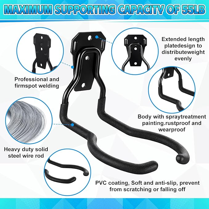 - Brackets: the garage tool hooks feature a heavy duty solid steel structure, supporting up to 55 pounds, securely hanging heavy tools; Its unique double crossbar design combined with a fully wrapped non slip PVC coating effectively prevents slipping and scratching; The rust proof and wear resistant black painted surface ensures durability