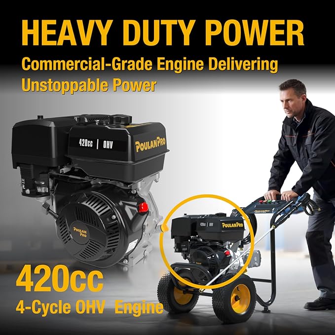 - Commercial-Grade Power : Engineered for demanding professional use, this heavy-duty gas pressure washer is equipped with a 420cc 4-cycle OHV horizontal shaft engine for effortless startup and relentless cleaning power. Ideal for patios, sidewalks, siding, vehicles, and industrial equipment, it tackles stubborn grease, grime, and stains with commercial efficiency