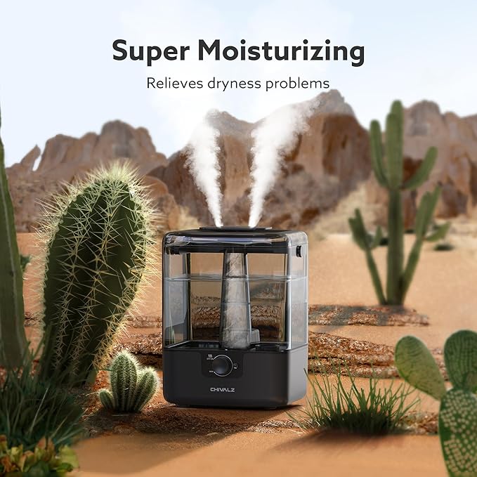 - Quiet and Easy to Operate: The cold mist humidifier only requires one knob to control the mist output, with a noise level as low as 26dB. The blue night light can be optionally turned off, creating a comfortable and peaceful atmosphere that will not interfere with your sleep. CHIVALZ humidifier is an ideal choice for bedrooms, large rooms, baby nursery, offices, indoor plant humidifiers